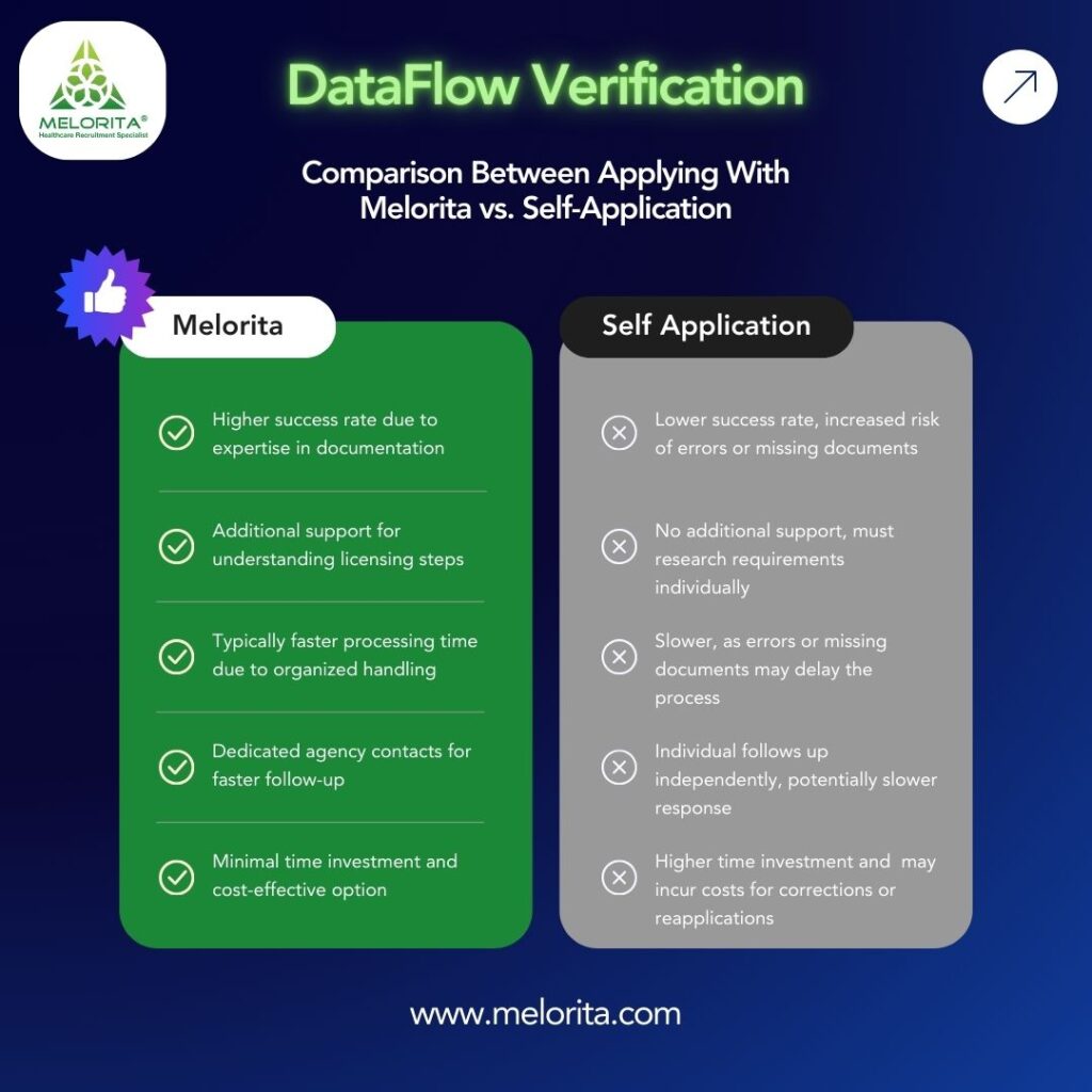 At Melorita, we understand how crucial this step is for your career, and we are here to make the process faster, easier, and more efficient. Our expertise in handling DataFlow verification has helped countless healthcare professionals achieve their dream of working abroad without unnecessary delays or complications.
